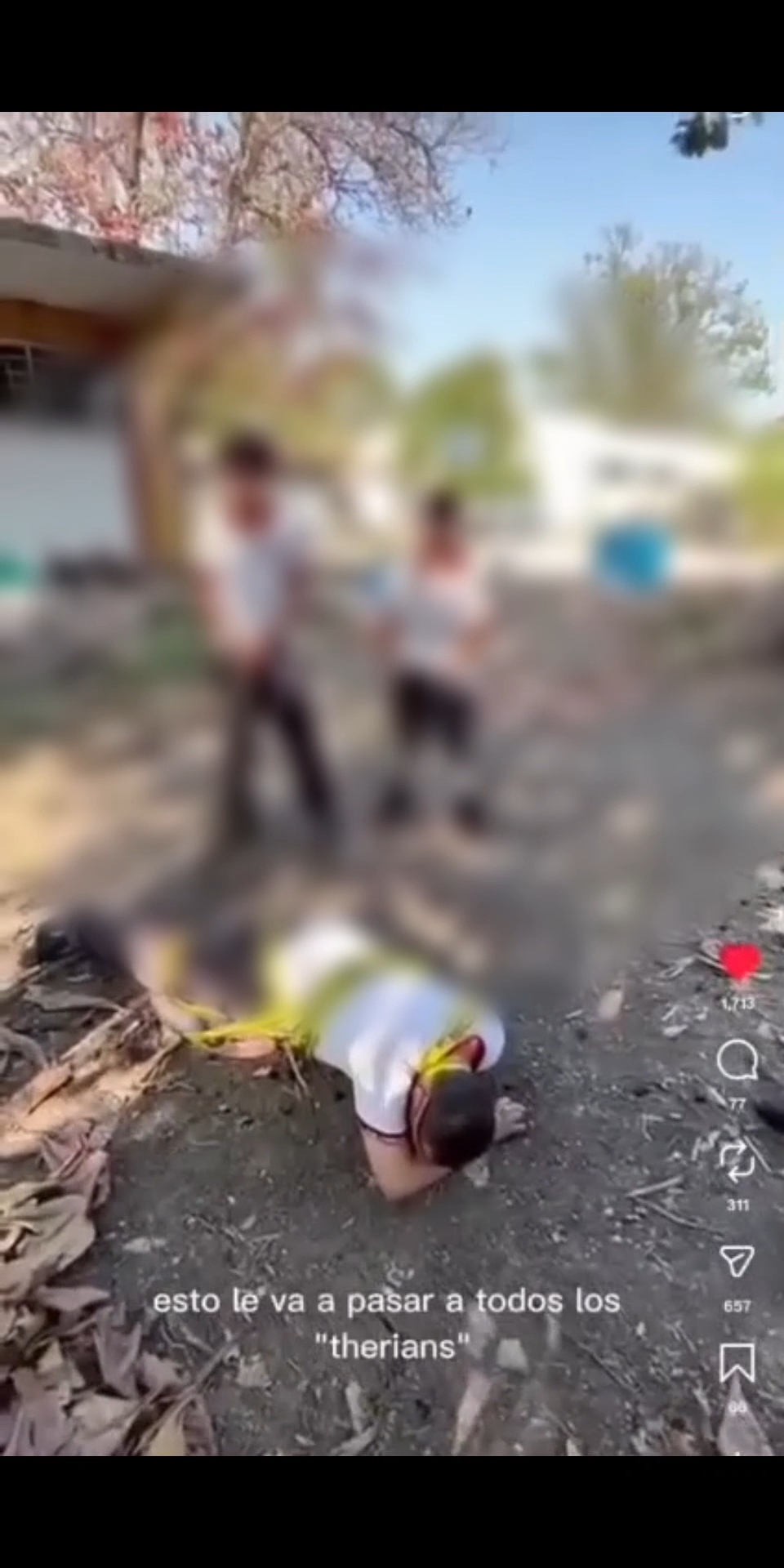 En las imágenes se observa a varios estudiantes simulando una agresión contra un compañero que permanece acostado en el piso, mientras otros le dan correazos y golpes con una tabla como parte de la representación. Durante la grabación se escucha la frase: “Esto le va a pasar a todos los therian”, en un contexto de burla.